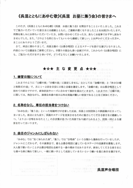 2026年より「呉混とともにあゆむ歌」「呉混 お昼に集う会」を閉会し、新たに呉混主催「公募合唱団」によるステージを設ける運びとなりました。詳細は以下の書類をご確認ください。