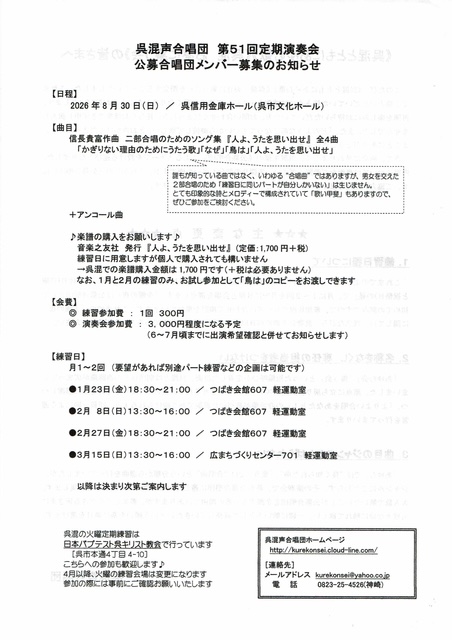 【2026年第51回呉混声合唱団定期演奏会 公募合唱団の曲目】